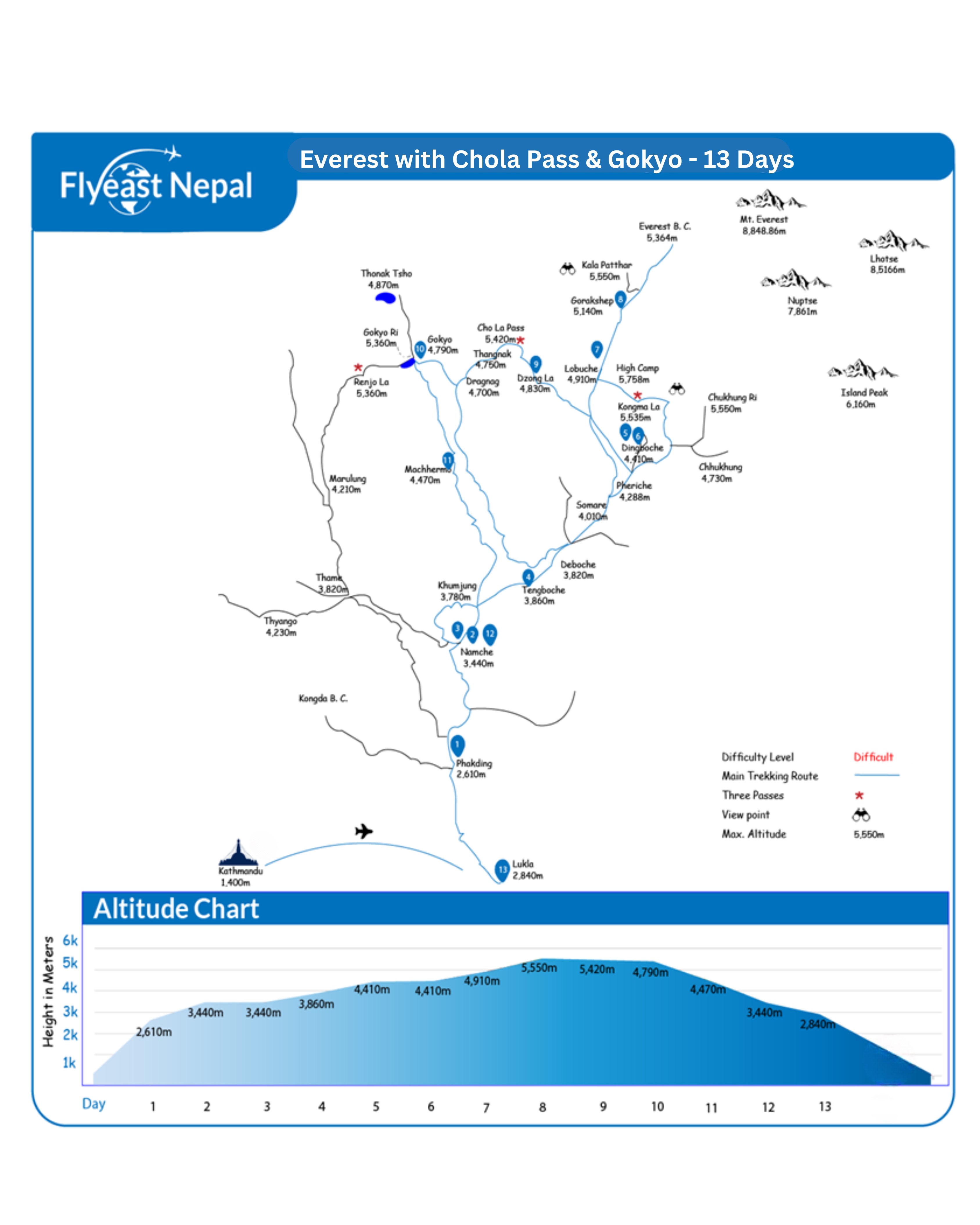 You will be using normal teahouse accommodation during the trekking days in the mountain. During peak season (Autumn- Sep-Nov) and (Spring- March-May) the teahouses and the trail is crowded. Since Autumn and Spring is the best season or best time of the year to trek to Everest with Chola Pass & Gokyo. However, Flyeast Nepal's experienced and professional team is always there to ensure your safety and luxury all around the year.